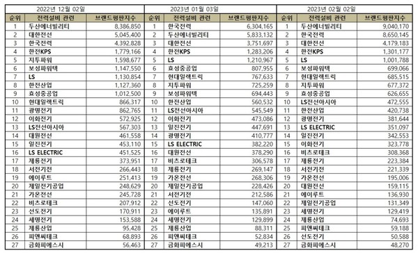 전력설비 상장기업 브랜드평판 2023년 2월 빅데이터 분석 순위는 두산에너빌리티, 한국전력, 대한전선, 한전KPS, LS, 보성파워텍, 현대일렉트릭, 지투파워, 효성중공업, LS전선아시아, 한전산업, 광명전기, LS ELECTRIC, 일진전기, 이화전기, 비츠로테크, 제룡전기 , 서전기전, 가온전선, 대원전선, 에이루트, 제일전기공업, 세명전기, 제룡산업, 피앤씨테크, 선도전기, 금화피에스시 순이었다.