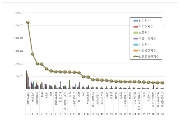 3위, 서울반도체 브랜드는 참여지수 132,741 미디어지수 222,819 소통지수 310,030 커뮤니티지수 163,943 시장지수 146,849 사회공헌지수 25,901이 되면서 브랜드평판지수 1,002,283으로 분석됐다. 지난 1월 브랜드평판지수 1,302,865와 비교해보면 23.07% 하락했다.