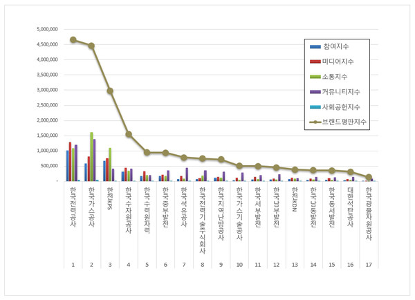 에너지 공기업 브랜드평판 1위를 기록한 한국전력공사 브랜드는 참여지수 1,023,580 미디어지수 1,289,546 소통지수 1,088,812 커뮤니티지수 1,198,136 사회공헌지수 55,227이 되면서 브랜드평판지수 4,655,300으로 분석됐다. 지난 1월 브랜드평판지수 4,740,201과 비교해보면 1.79% 하락했다.