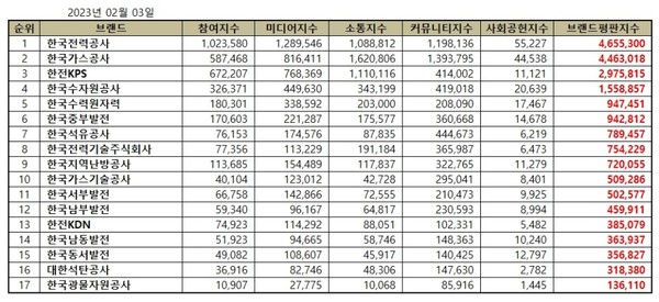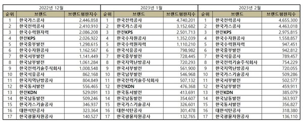 2023년 2월 에너지 공기업 브랜드평판 순위는 한국전력공사, 한국가스공사, 한전KPS, 한국수자원공사, 한국수력원자력, 한국중부발전, 한국석유공사, 한국전력기술주식회사, 한국지역난방공사, 한국가스기술공사, 한국서부발전, 한국남부발전, 한전KDN, 한국남동발전, 한국동서발전, 대한석탄공사, 한국광물자원공사 순으로 분석됐다.