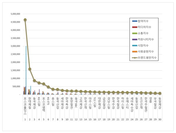 철강 상장기업 브랜드평판 1위를 기록한 포스코홀딩스 브랜드는 참여지수 213,882 미디어지수 470,058 소통지수 434,218 커뮤니티지수 501,595 시장지수 3,016,433 사회공헌지수 12,658이 되면서 브랜드평판지수 4,648,843으로 분석됐다. 지난 1월 브랜드평판지수 4,404,147과 비교해보면 5.56% 상승했다.