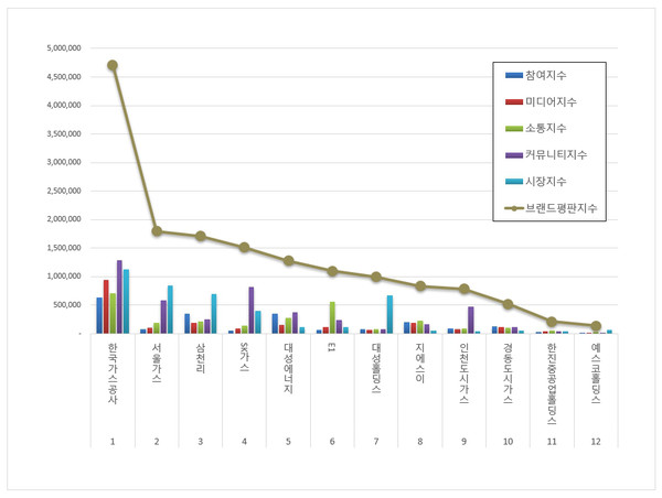 가스 유틸리티 상장기업 브랜드평판 1위를 기록한 한국가스공사 브랜드는 참여지수 640,541 미디어지수 940,732 소통지수 707,212 커뮤니티지수 1,293,554 시장지수 1,132,292가 되면서 브랜드평판지수 4,714,332로 분석됐다. 지난 1월 브랜드평판지수 6,752,283과 비교해보면 30.18% 하락했다.