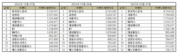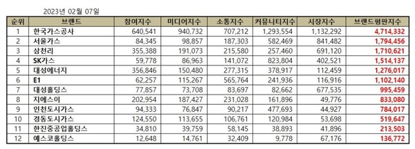 [이넷뉴스] 2023년 2월 가스 유틸리티 상장기업 브랜드평판이 공개됐다.