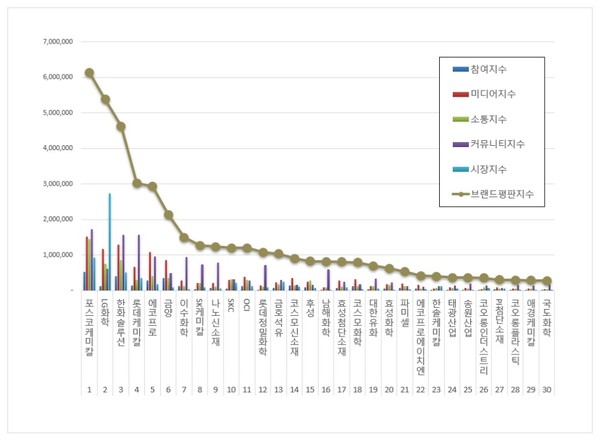 2023년 2월 화학 상장기업 브랜드평판 30위 순위는 포스코케미칼, LG화학, 한화솔루션, 롯데케미칼, 에코프로, 금양, 이수화학, SK케미칼, 나노신소재, SKC, OCI, 롯데정밀화학, 금호석유, 코스모신소재, 후성, 남해화학, 효성첨단소재, 코스모화학, 대한유화, 효성화학, 파미셀, 에코프로에이치엔, 한솔케미칼, 태광산업, 송원산업, 코오롱인더스트리, PI첨단소재, 코오롱플라스틱, 애경케미칼, 국도화학 순으로 분석됐다.