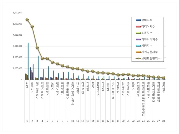 3위, 레고켐바이오 브랜드는 참여지수 188,797 미디어지수 168,123 소통지수 160,738 커뮤니티지수 129,296 시장지수 2,141,221 사회공헌지수 87,798이 되면서 브랜드평판지수 2,875,974로 분석됐다. 지난 1월 브랜드평판지수 4,488,428과 비교해보면 35.92% 하락했다.