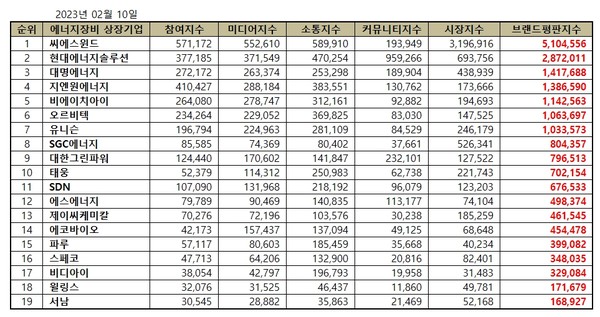 이넷뉴스 에너지 톱 브랜드위원회는 10일 에너지장비 상장기업 ‘2023년 2월 빅데이터 분석결과’를 발표했다. 발표에 따르면 1위 씨에스원드 2위 현대에너지솔루션 3위 대명에너지 순으로 나타났다.