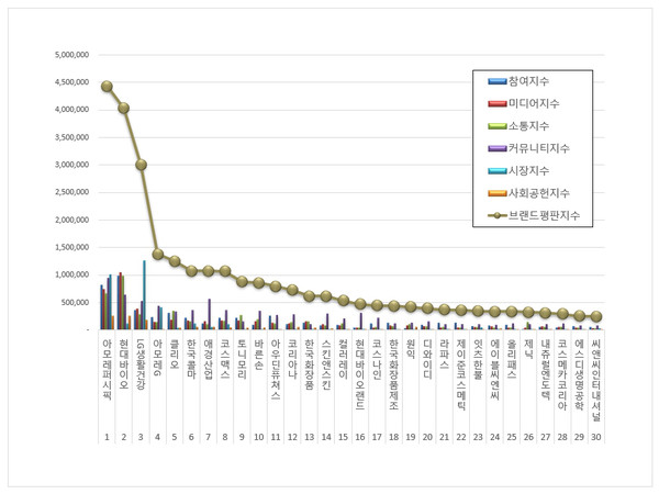 화장품 상장기업 브랜드평판 1위를 기록한 아모레퍼시픽 브랜드는 참여지수 815,826 미디어지수 747,378 소통지수 664,793 커뮤니티지수 944,913 시장지수 1,007,008 사회공헌지수 254,577이 되면서 브랜드평판지수 4,434,495로 분석됐다. 지난 1월 브랜드평판지수 4,101,561과 비교해보면 8.12% 상승했다.