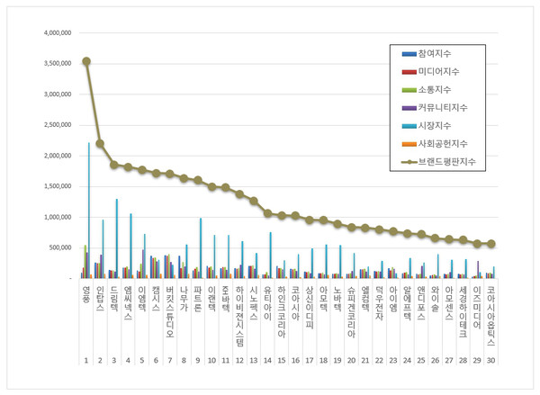 2위, 인탑스 브랜드는 참여지수 263,534 미디어지수 254,491 소통지수 251,950 커뮤니티지수 390,279 시장지수 964,213 사회공헌지수 78,770이 되면서 브랜드평판지수 2,203,237로 분석됐다. 지난 1월 브랜드평판지수 1,747,360과 비교해보면 26.09% 상승했다.