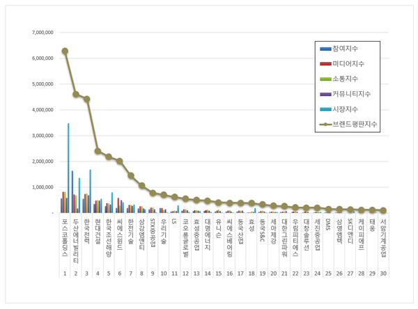 2위, 두산에너빌리티 브랜드는 참여지수 1,639,921 미디어지수 728,493 소통지수 700,080 커뮤니티지수 177,627 시장지수 1,377,249가 되면서 브랜드평판지수 4,623,370으로 분석됐다. 지난 1월 브랜드평판지수 6,068,076과 비교해보면 23.81% 하락했다.