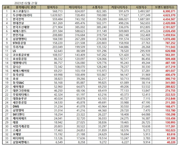 이넷뉴스 에너지 톱 브랜드위원회는 21일 풍력에너지 관련 상장기업 ‘2023년 2월 빅데이터 분석결과’를 발표했다. 발표에 따르면, 1위 포스코홀딩스 2위 두산에너빌리티 3위 한국전력 순으로 나타났다.