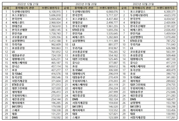 한편, 이넷뉴스 에너지 톱 브랜드위원회와 한국기업평판연구소는 매달 국내 에너지 기업 및 브랜드 평판지수를 측정해 변화량을 발표하고 있다. 국내 에너지 업계 현황을 파악하고, 에너지 산업을 전망하는 데 중요 지표가 되고 있다는 평가를 받고 있다.