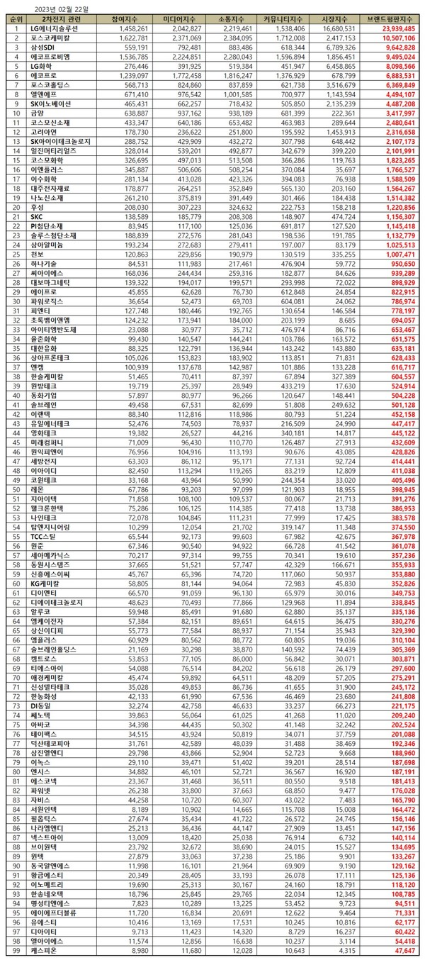 [이넷뉴스] 2차전지 관련 상장기업 2023년 2월 브랜드평판이 공개됐다.
