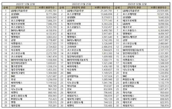 2차전지 관련 상장기업 브랜드평판 2023년 2월 빅데이터 분석 30위 순위는 LG에너지솔루션, 포스코케미칼, 삼성SDI, 에코프로비엠, LG화학, 에코프로, 포스코홀딩스, 엘앤에프, SK이노베이션, 금양, 코스모신소재, 고려아연, SK아이이테크놀로지, 일진머티리얼즈, 코스모화학, 이엔플러스, 이수화학, 대주전자재료, 나노신소재, 후성, SKC, PI첨단소재, 솔루스첨단소재, 삼아알미늄, 천보, 하나기술, 씨아이에스, 대보마그네틱, 에이프로, 파워로직스 순이었다.
