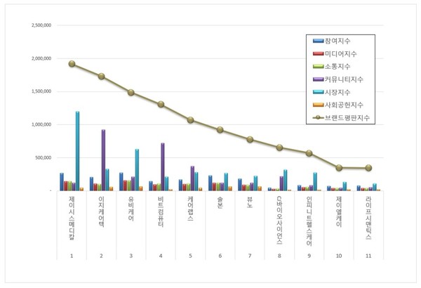 3위, 유비케어 브랜드는 참여지수 271,954 미디어지수 154,807 소통지수 155,930 커뮤니티지수 210,501 시장지수 628,980 사회공헌지수 65,392가 되면서 브랜드평판지수 1,487,564로 분석됐다. 지난 1월 브랜드평판지수 861,607과 비교해보면 72.65% 상승했다.