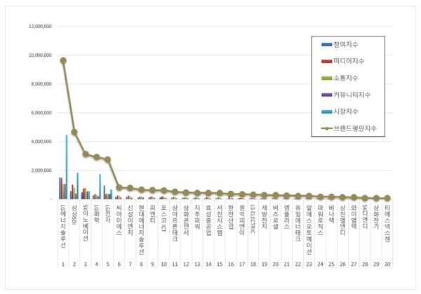 1위, LG에너지솔루션 브랜드는 참여지수 1,506,166 미디어지수 1,498,730 소통지수 1,082,908 커뮤니티지수 1,074,793 시장지수 4,491,396이 되면서 브랜드평판지수 9,653,993으로 분석됐다. 지난 1월 브랜드평판지수 8,401,249와 비교해보면 14.91% 상승했다.