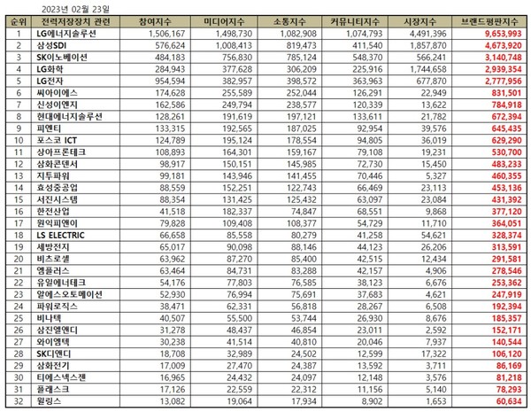 이넷뉴스 에너지 톱 브랜드위원회는 23일 전력저장장치 ESS 관련 상장기업 ‘2023년 2월 빅데이터 분석결과’를 발표했다. 발표에 따르면, 1위 LG에너지솔루션 2위 삼성SDI 3위 SK이노베이션 순으로 나타났다.
