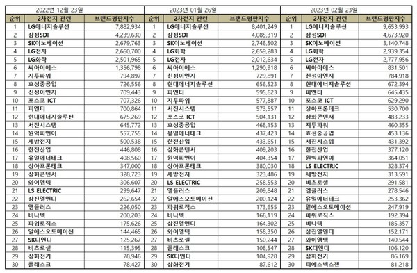 - LG에너지솔루션, 전기제품 브랜드평판 1위···에코프로비엠·삼성SDI 뒤이어