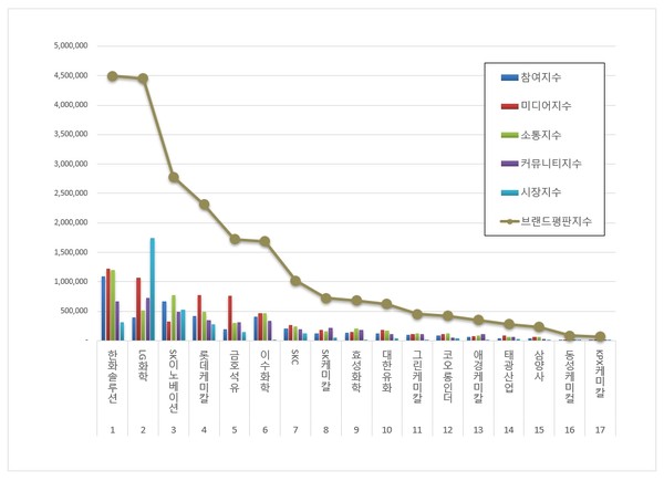 4위, 롯데케미칼 브랜드는 참여지수 423,654 미디어지수 770,201 소통지수 494,451 커뮤니티지수 350,287 시장지수 271,644가 되면서 브랜드평판지수 2,310,238로 분석됐다. 지난 1월 브랜드평판지수 2,619,210과 비교해보면 11.80% 하락했다.