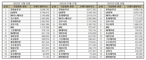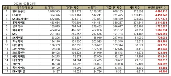 석유화학 관련 상장기업 브랜드평판 2023년 2월 빅데이터 분석 순위는 한화솔루션, LG화학, SK이노베이션, 롯데케미칼, 금호석유, 이수화학, SKC, SK케미칼, 효성화학, 대한유화, 그린케미칼, 코오롱인더, 애경케미칼, 태광산업, 삼양사, 동성케미컬, KPX케미칼 순이었다.