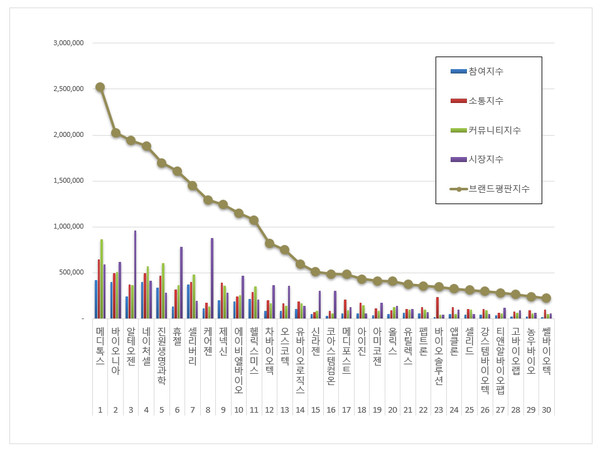 생물공학 상장기업 브랜드평판 분석은 참여지수, 소통지수, 커뮤니티지수, 시장지수로 구분하여 브랜드평판지수를 산출했다.