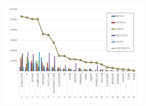 3위, 한국전력 브랜드는 참여지수 808,008 미디어지수 1,016,056 소통지수 800,998 커뮤니티지수 1,654,976 시장지수 781,940이 되면서 브랜드평판지수 5,061,978로 분석됐다. 지난 1월 브랜드평판지수 4,196,273과 비교해보면 20.63% 상승했다.