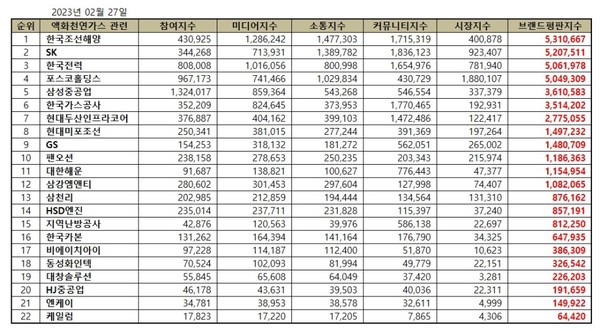 이넷뉴스 에너지 톱 브랜드위원회는 27일 액화천연가스 LNG 관련 상장기업 ‘2023년 2월 빅데이터 분석결과’를 발표했다. 발표에 따르면, 1위 한국조선해양 2위 SK 3위 한국전력 순으로 나타났다.
