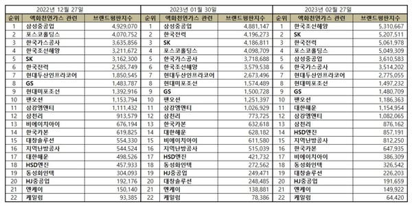 한편, 이넷뉴스 에너지 톱 브랜드위원회와 한국기업평판연구소는 매달 국내 에너지 기업 및 브랜드 평판지수를 측정해 변화량을 발표하고 있다. 국내 에너지 업계 현황을 파악하고, 에너지 산업을 전망하는 데 중요 지표가 되고 있다는 평가를 받고 있다.
