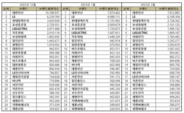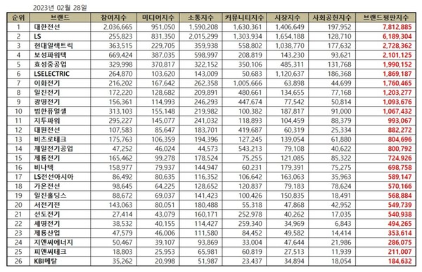 전기장비 상장기업 브랜드평판 2023년 2월 빅데이터 분석 순위는 대한전선, LS, 현대일렉트릭, 보성파워텍, 효성중공업, LSELECTRIC, 이화전기, 일진전기, 광명전기, 범한퓨얼셀, 지투파워, 대원전선, 비츠로테크, 제일전기공업, 제룡전기, 비나텍, LS전선아시아, 가온전선, 일진홀딩스, 서전기전, 선도전기, 세명전기, 제룡산업, 지엔씨에너지, 피앤씨테크, KBI메탈 순이었다.