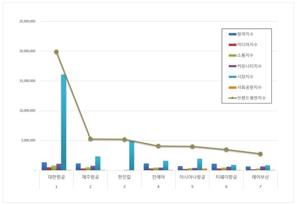 항공사 상장기업 브랜드평판 1위를 기록한 대한항공 브랜드는 참여지수 1,361,272 미디어지수 500,624 소통지수 796,092 커뮤니티지수 1,092,927 시장지수 16,065,185 사회공헌지수 79,220이 되면서 브랜드평판지수 19,895,320으로 분석됐다. 지난 2월 브랜드평판지수 24,128,855와 비교해보면 17.55% 하락했다.