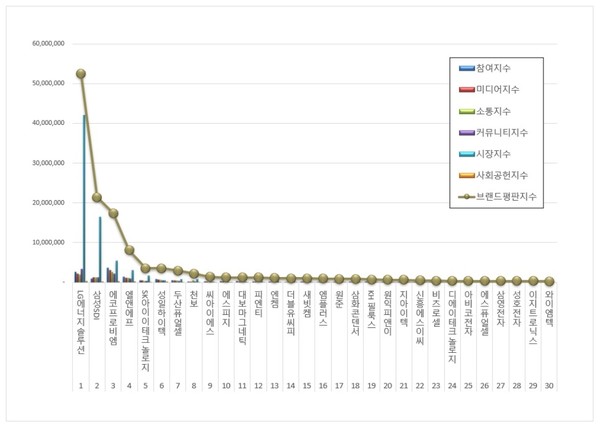 전기제품 상장기업 브랜드평판 1위를 기록한 LG에너지솔루션 브랜드는 참여지수 2,573,235 미디어지수 2,154,799 소통지수 1,948,168 커뮤니티지수 3,380,069 시장지수 42,052,608 사회공헌지수 360,744가 되면서 브랜드평판지수 52,469,623으로 분석됐다. 지난 2월 브랜드평판지수 45,498,180과 비교해보면 15.32% 상승했다.