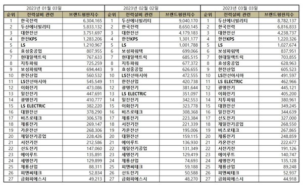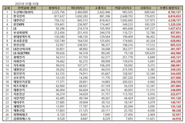 전력설비 상장기업 브랜드평판 2023년 3월 빅데이터 분석 순위는 두산에너빌리티, 한국전력, 대한전선, 한전KPS, LS, 보성파워텍, 현대일렉트릭, 효성중공업, 한전산업, LS전선아시아, LS ELECTRIC, 광명전기, 이화전기, 지투파워, 대원전선, 일진전기, 선도전기, 제일전기공업, 비츠로테크, 제룡전기 , 가온전선, 서전기전, 에이루트, 세명전기, 제룡산업, 피앤씨테크, 금화피에스시 순이었다.