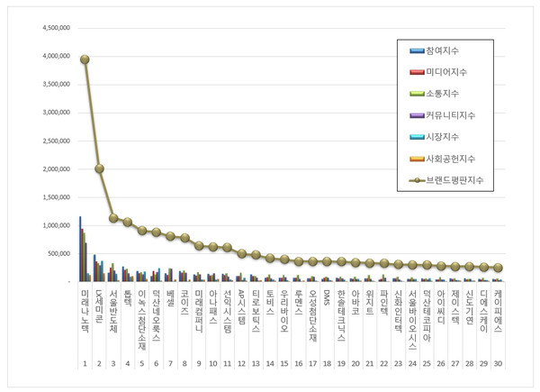 4위, 톱텍 브랜드는 참여지수 274,155 미디어지수 213,193 소통지수 233,001 커뮤니티지수 152,114 시장지수 91,743 사회공헌지수 99,408이 되면서 브랜드평판지수 1,063,614로 분석됐다. 지난 2월 브랜드평판지수 718,030과 비교해보면 48.13% 상승했다.